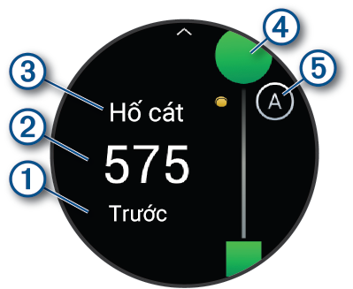 LƯU Ý: Vì vị trí ghim định vị thay đổi, đồng hồ tính toán khoảng cách đến phía trước, giữa và sau vùng green, tuy nhiên, không tính vị trí ghim định vị thực tế.