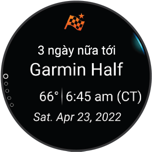 Bạn có thể thêm sự kiện cuộc đua đến lịch Garmin Connect, bạn có thể xem sự kiện trên đồng hồ bằng cách thêm tổng quan cuộc đua chính (Công cụ tổng quan). Ngày diễn ra sự kiện phải trong 365 ngày tới. Đồng hồ hiển thị thời gian đếm ngược đến sự kiện, thời gian mục tiêu của bạn hoặc thời gian kết thúc dự đoán (chỉ các sự kiện chạy bộ) và thông tin thời tiết.