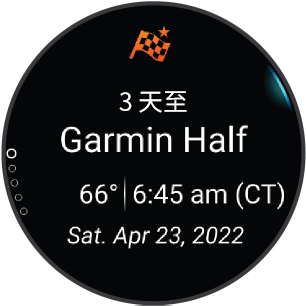 當您將賽事新增至您的 Garmin Connect 行事曆時,您可以新增主要賽事概覽以在手錶上檢視賽事(概覽)。賽事日期必須在接下來的 365 天內。手錶會顯示賽事倒數、您的目標時間或預估完賽時間(僅限跑步賽事),以及天氣資訊。