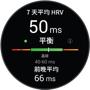 手錶會分析您在睡眠期間的腕式心率讀數以決定您的心率變異度(HRV)。訓練、運動、睡眠、營養,以及健康習慣都會影響心率變異度。HRV 值會因性別、年齡與體能而大不相同。一個平衡的 HRV 狀態可能是健康狀況良好的跡象,例如訓練與恢復的平衡良好、心血管健康,或對壓力有韌性。不平衡或不佳的狀態,則可能是疲勞、需要更多恢復或壓力增加的跡象。要獲得最佳的結果,您應戴著手錶入睡。手錶需要三週的穩定睡眠資料來顯示您的心率變異度狀態。