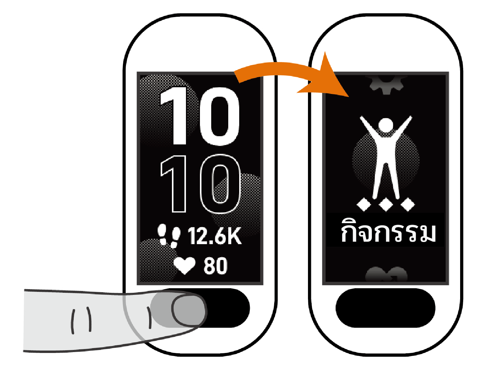 ดูวิจิทและเมนู จากหน้าปัดนาฬิกา กด เพื่อเข้าสู่เมนูหลัก จากหน้าปัดนาฬิกา ปัดไปทางขวาเพื่อดูการควบคุมเมนู จากหน้าปัดนาฬิกา ปัดขึ้นหรือลงเพื่อดูวิจิท หน้าหลักบทนำดูวิจิทและเมนู