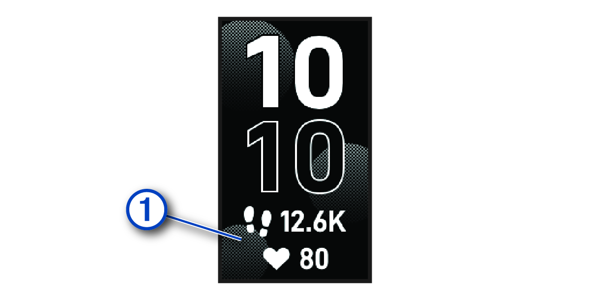 錶面資料欄位部分 vívosmart 5 錶面可以顯示資料欄位(更換錶面)。您可以點一下錶面 ① 以瀏覽步數、心率、電池電量、日期、天氣、消耗的卡路里、熱血時間,以及身體能量指數。螢幕關閉後再開啟時會顯示您上一次選擇的資料欄位。首頁產品介紹錶面資料欄位