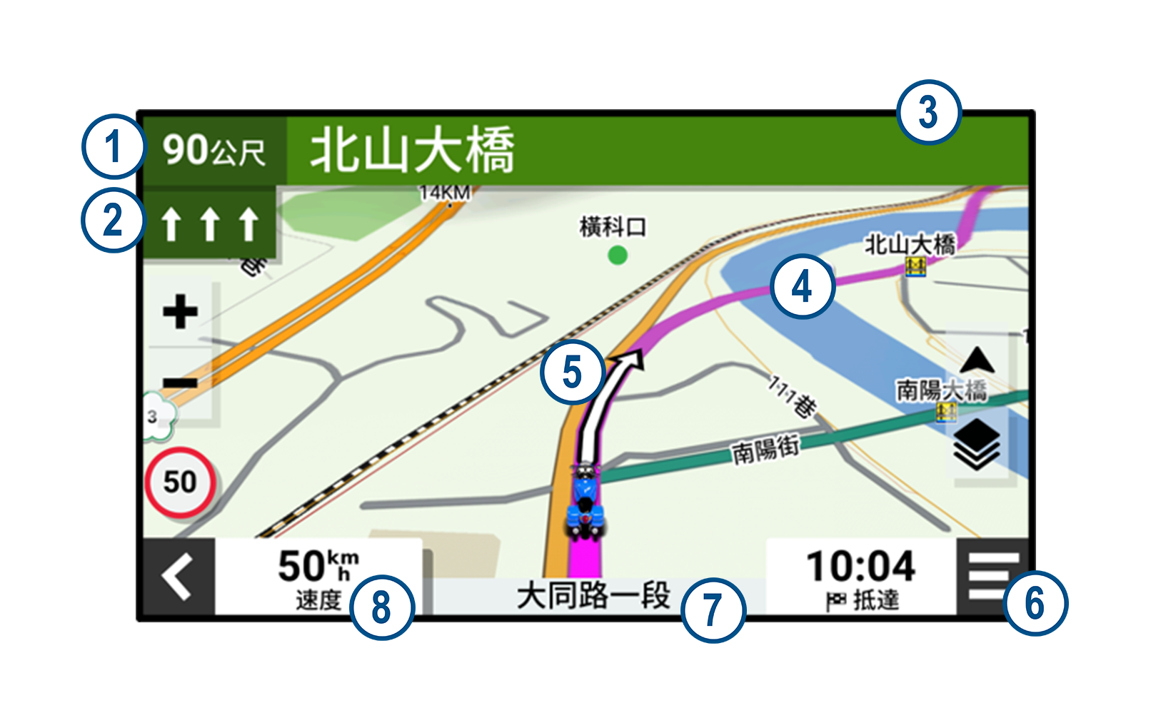 旅途中,裝置會使用語音提示和地圖上的資訊來引導您前往目的地。下個轉彎、出口或其他指令會出現在地圖頂部。