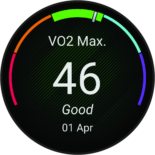 On the device, your VO2 max. estimate appears as a number, description, and position on the color gauge. On your Garmin Connect™ account, you can view additional details about your VO2 max. estimate, such as where it ranks for your age and sex.