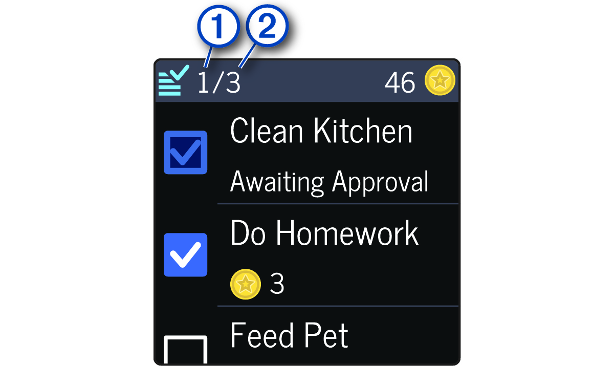 You can create a list of chores in the Garmin Jr.™ app to send to the watch. Your child can mark the chores as completed on the watch to earn coins, which can be traded for rewards.