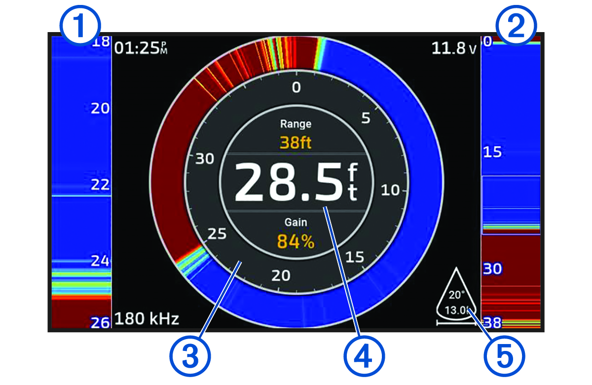 The flasher shows sonar information on a circular depth scale, indicating what is beneath your boat. It is organized as a ring that starts at the top and progresses clockwise. Depth is indicated by the scale inside the ring. Sonar information flashes on the ring when it is received at the depth indicated.