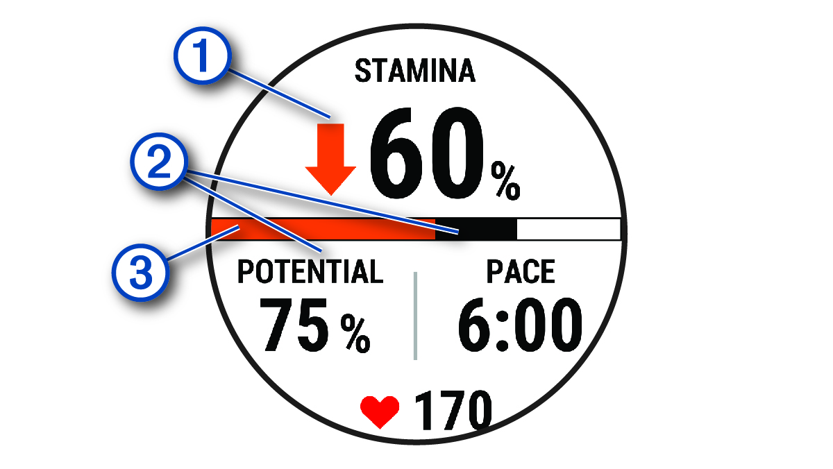 Primary stamina data field. Shows your current stamina percentage, distance remaining, or time remaining.