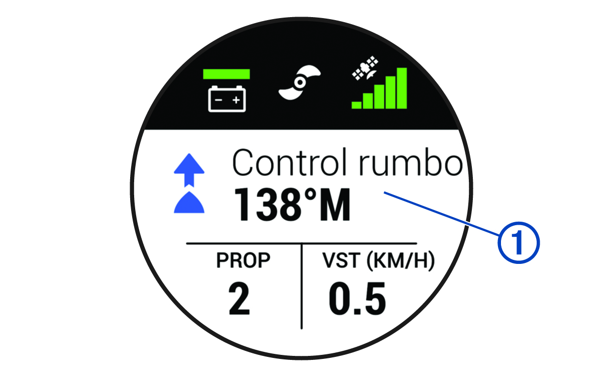 Muestra el estado de la hélice. Blanco y girando: la hélice está realizando un empuje hacia delante. Rojo y girando: la hélice está realizando un empuje inverso.1 No gira: la hélice está encendida con la velocidad establecida en cero. No se ve: la hélice está apagada. |
