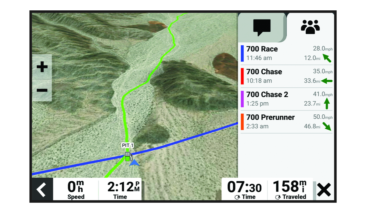Using the Chase Map You can use the Chase Map feature to keep track of your team members. From the main menu, select Chase Map. Select an option: To view a team member's location, select the team member. To navigate to a point on the map, tap a map location, and select Go!. Parent Topic: Off-Road Racing FeaturesHomeOff-Road Racing FeaturesUsing the Chase Map