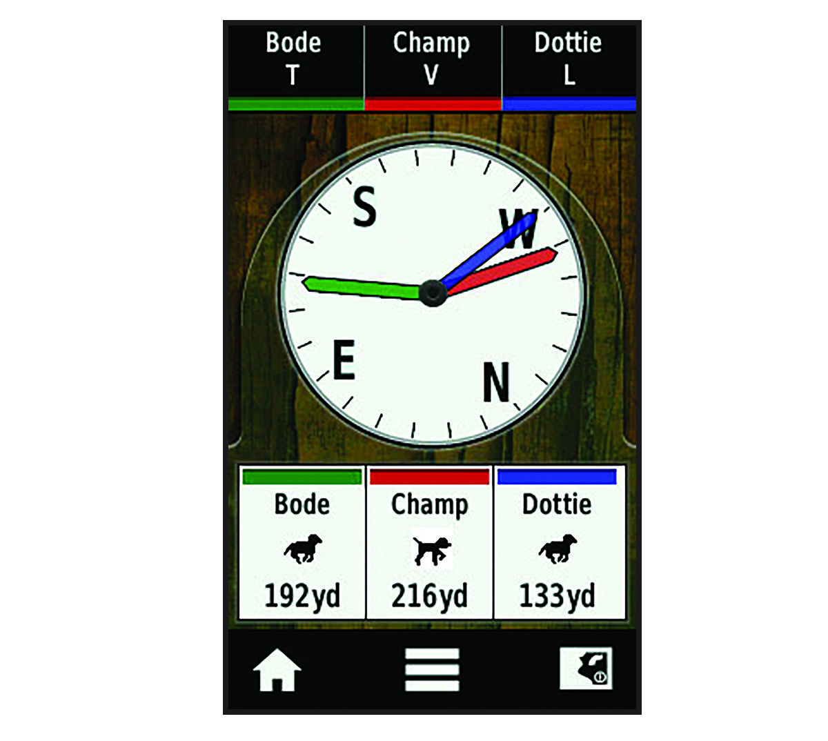 You can use the dog tracking compass to view the direction and distance to your dog. The dog tracking compass also shows the dog's status, such as running or on point (Dog Status Icons). The color of the pointer corresponds to the color of the dog track.