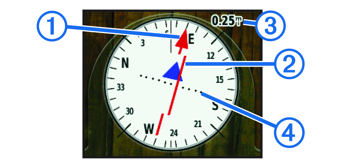 Kurspekaren anger ditt förhållande till en kurslinje som leder till destinationen. Kursavvikelseindikatorn (CDI)