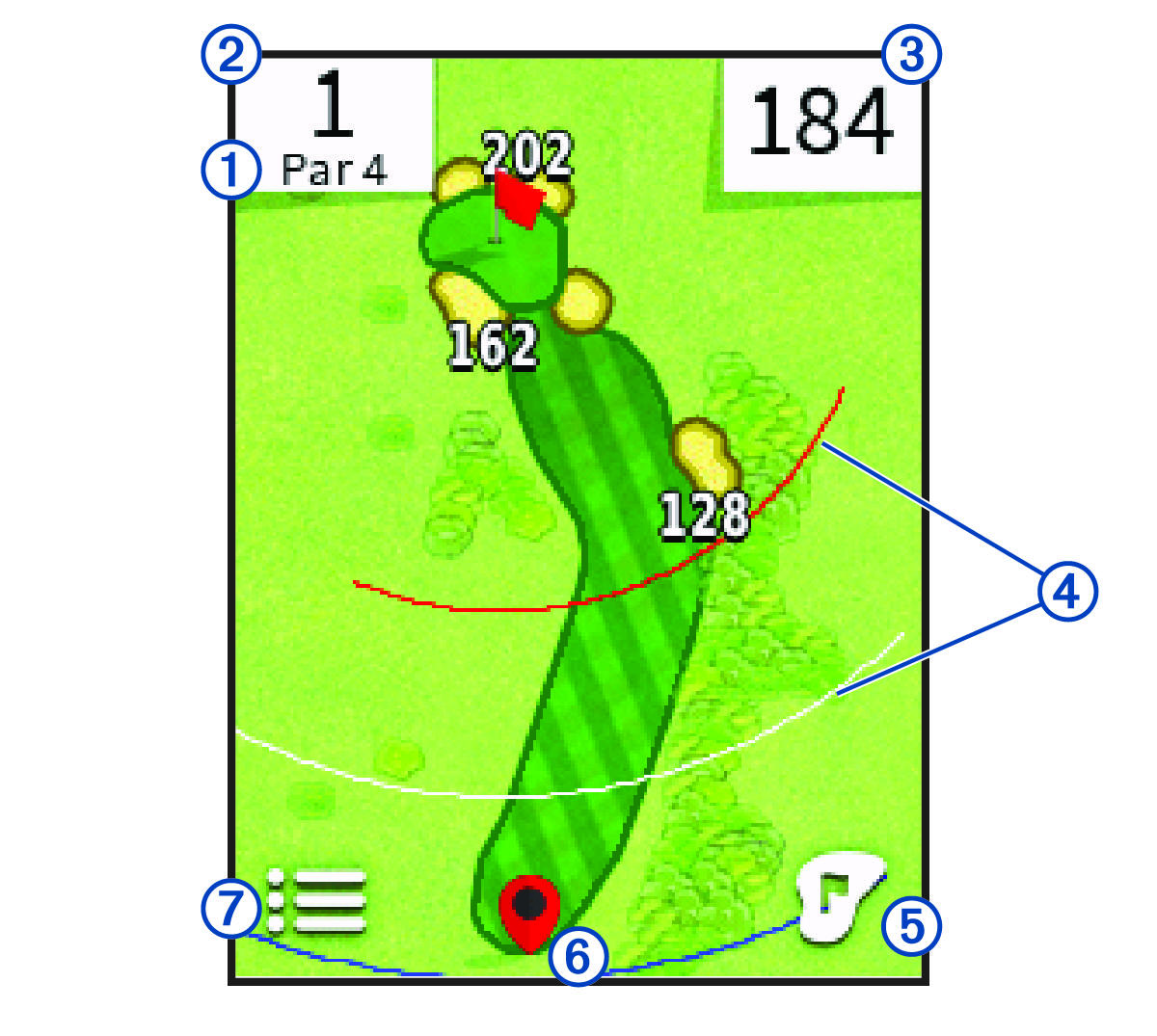 Displays layup arcs that indicate the distance to the pin in meters or yards. The colors indicate distance: red is 100, white is 150, blue is 200, and yellow is 250. Four arcs appear for par 5 or higher, three arcs appear for par 4, and zero arcs appear for par 3. |