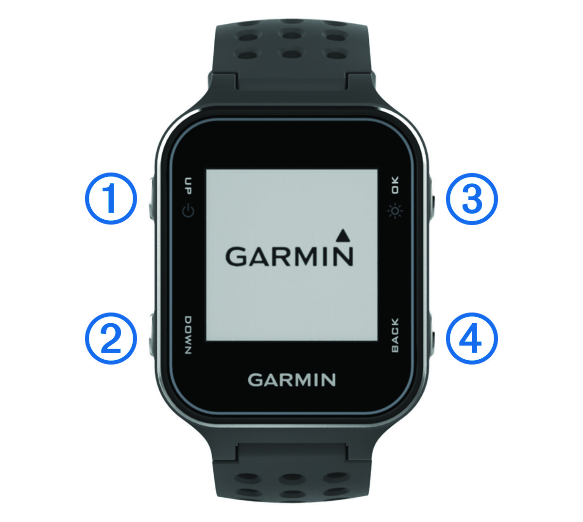 Hold to turn the device on and off. Select to scroll through menus, holes, and settings. |