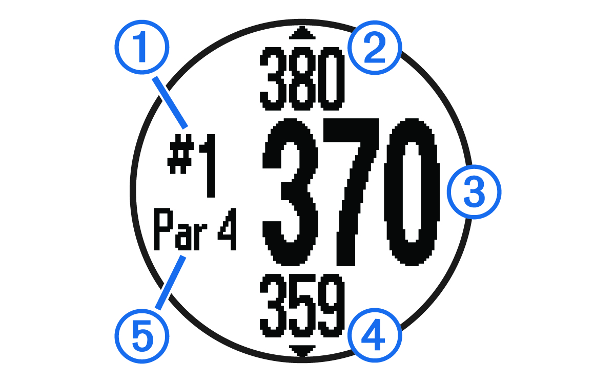 POZNÁMKA: Ve výchozím nastavení vypočítává zařízení celkovou vzdálenost k začátku, středu a konci greenu. Jestliže znáte polohu jamky, můžete ji nastavit přesněji pomocí Zobrazení greenu (Zobrazení greenu).