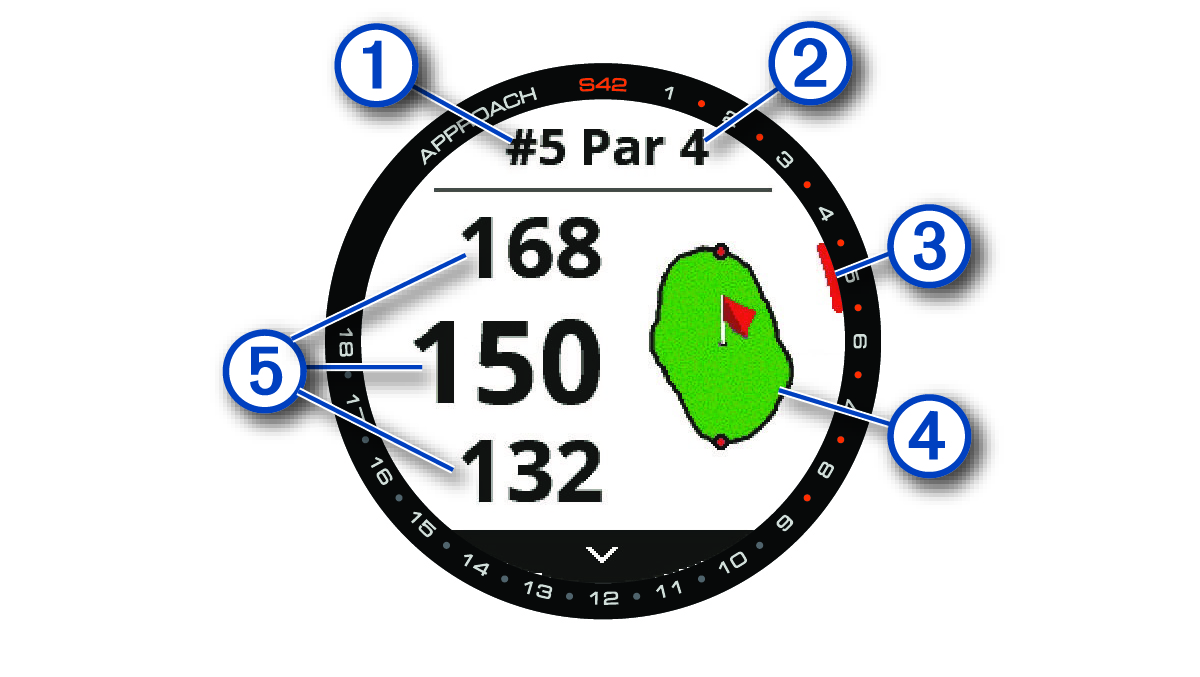 Auf dem Gerät wird das aktuelle Loch angezeigt, das Sie spielen. Zudem führt das Gerät den Übergang zum neuen Loch automatisch durch. Wenn Sie sich nicht an einem Loch befinden (beispielsweise im Clubhaus), zeigt das Gerät standardmäßig Loch 1 an. Sie können das Loch manuell ändern (Ändern von Löchern).