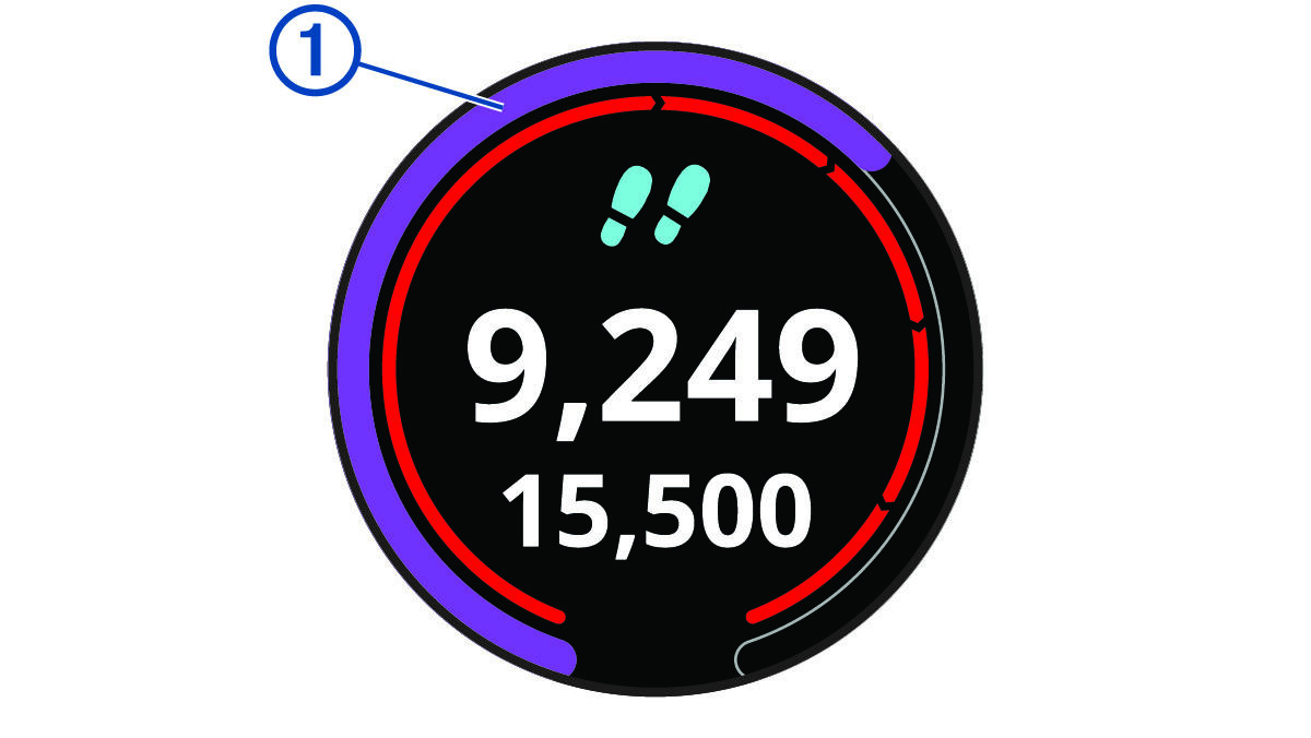 Das Gerät erstellt automatisch ein Tagesziel für Ihre Schritte, basierend auf Ihrem aktuellen Aktivitätsgrad. Während Sie im Laufe des Tages aktiv sind, zeigt das Gerät Ihren Fortschritt in Bezug auf Ihr Tagesziel an Beschriftung Nummer eins.