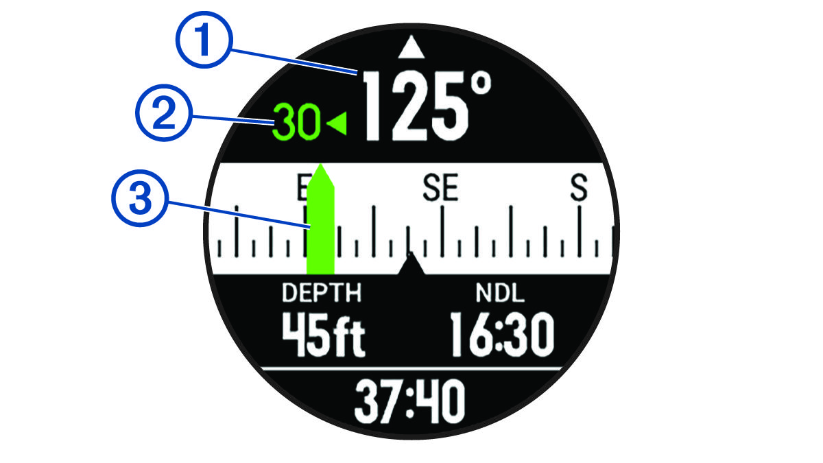 - Blättern Sie während eines Single- oder Multigas-Tauchgangs, eines CCR-Tauchgangs (Closed Circuit Rebreather) oder eines Gauge-Modus-Tauchgangs zum Tauchkompass.