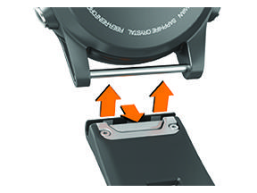 Auswechseln der QuickFit Armbänder Betätigen Sie die Verriegelung am QuickFit® Armband, und entfernen Sie es von der Uhr. Richten Sie das neue Armband auf die Uhr aus. Drücken Sie das Armband ein. HINWEIS: Vergewissern Sie sich, dass das Armband sicher befestigt ist. Die Verriegelung sollte über dem Stift einrasten. Wiederholen Sie die Schritte 1 bis 3, um das andere Armband auszuwechseln. Übergeordnetes Thema: GerätewartungStartseiteGerätewartungAuswechseln der QuickFit Armbänder