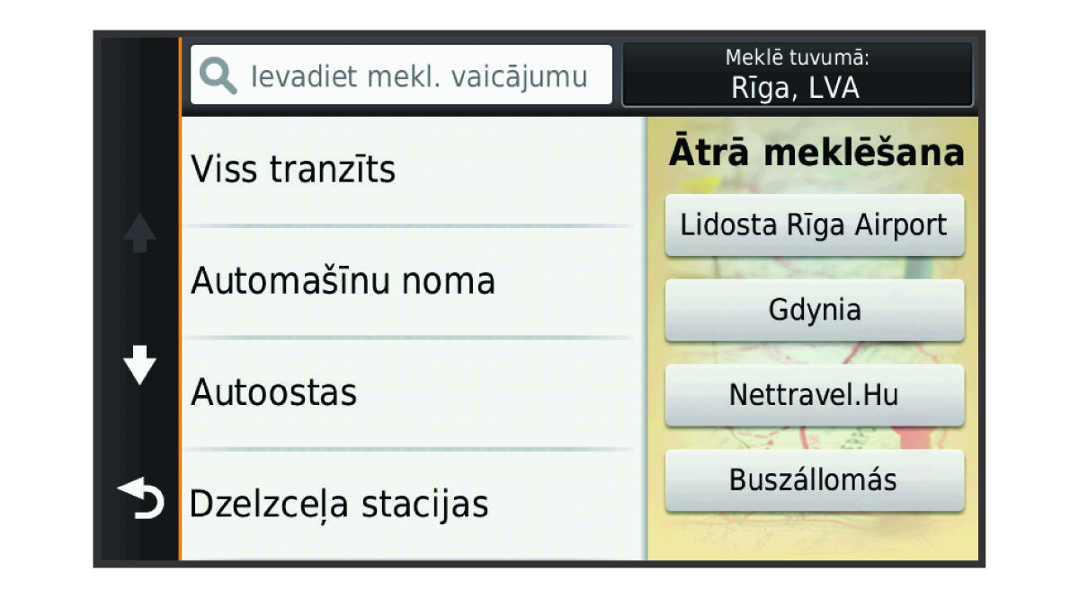 Kad ir pabeigta interesējošā objekta meklēšana, dažas kategorijas var rādīt ātrās meklēšanas sarakstu, kurā redzami pēdējie četri atlasītie galapunkti.