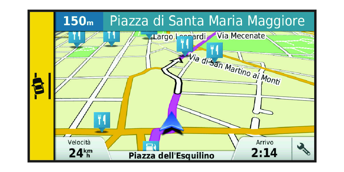The LDWS feature alerts you when the device detects you may be crossing a lane boundary unintentionally. For example, the device alerts you if you cross some solid painted lane boundaries. The LDWS feature provides alerts only when your vehicle speed exceeds 64 km/h (40 mph). The alert appears on the left or right side of the screen to indicate which lane boundary you crossed.