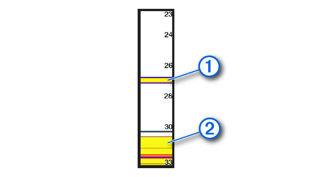 開啟 A-Scope 附註: 此功能在傳統聲納聲納檢視中提供使用。 A-Scope 是位於檢視右側的閃現直幅,顯示探頭目前下方有什麼。 在聲納資料快速捲過畫面時,例如您的船高速移動時,您可以使用 A-Scope 識別可能錯過的目標回波。 它也可以幫助偵測靠近海底的魚群。 以上 A-Scope 顯示魚群回波 與軟海底回波 。 從聲納檢視中選取MENU > 聲納設定 > 顯示設定 > A-視圖選單。 母主題: 傳統的 Garmin ClearVü 與 SideVü聲納設定首頁聲納魚群探測儀傳統的 Garmin ClearVü 與 SideVü聲納設定開啟 A-Scope