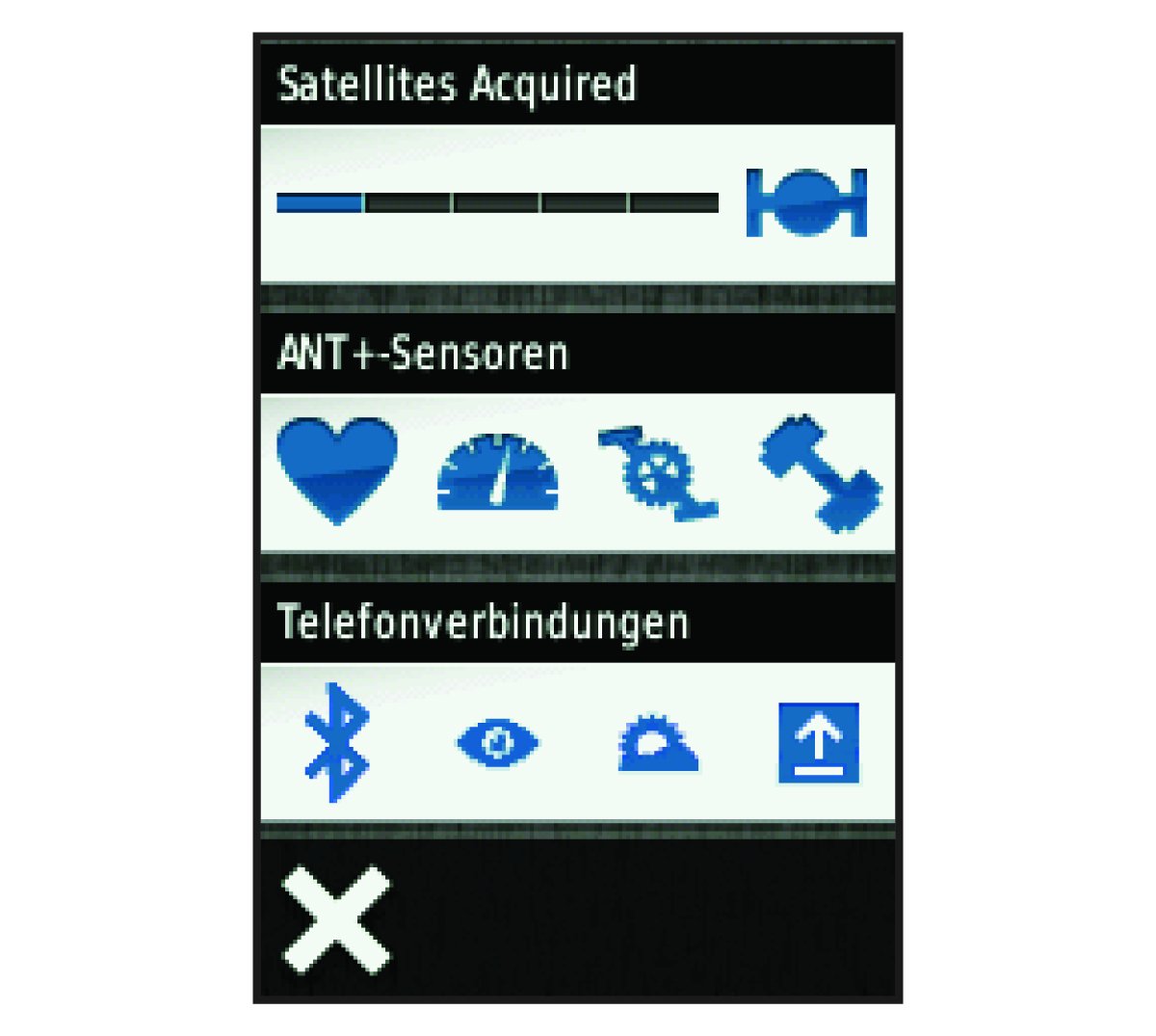 Auf der Statusseite der Sensoren/Verbindungen werden der Status der Satellitensignale, der ANT+®-Sensoren und des Smartphones angezeigt.