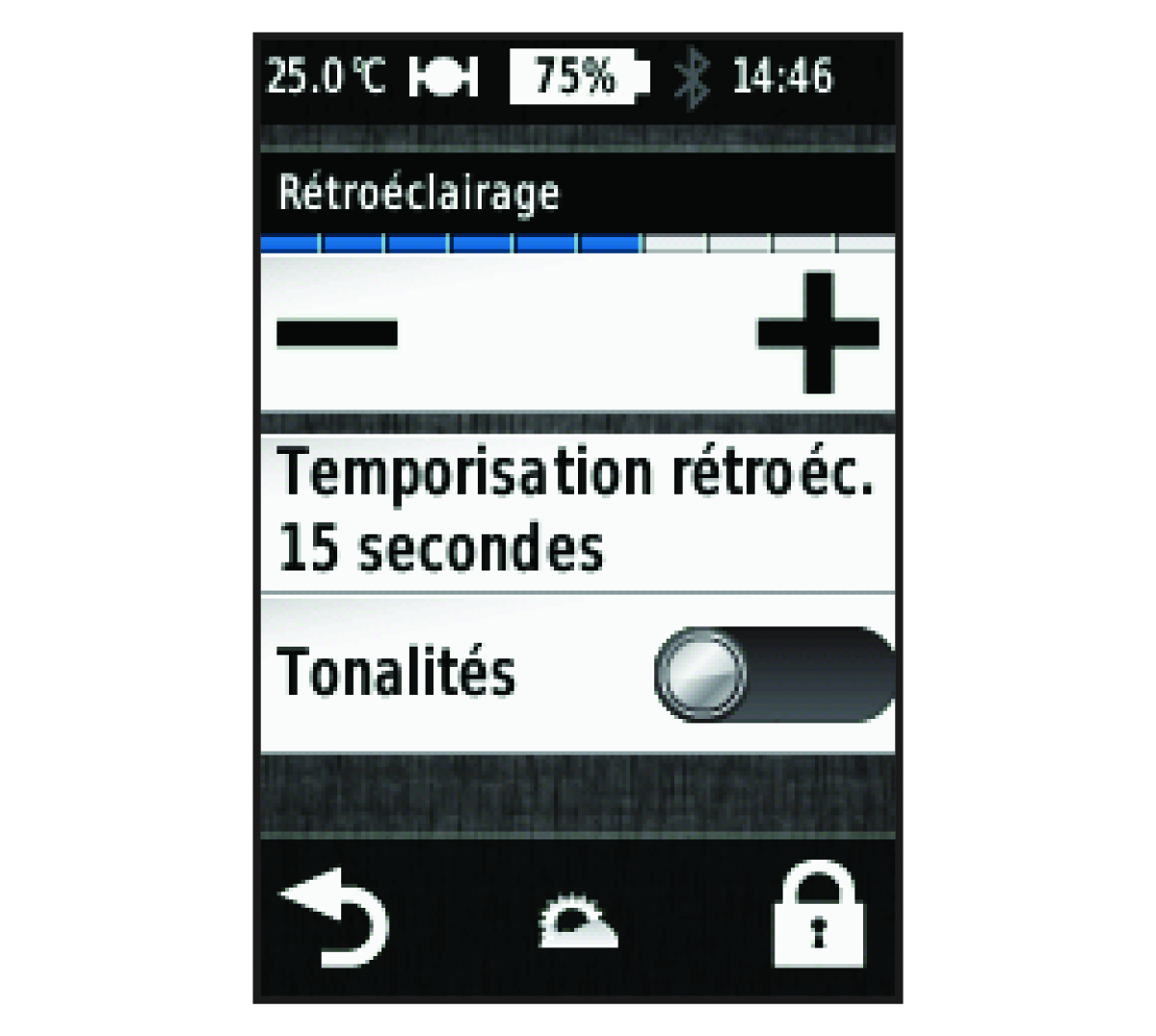 Utilisation du rétroéclairage A tout moment, touchez l'écran pour activer le rétroéclairage. Sélectionnez pour régler la luminosité et la temporisation du rétroéclairage. Rubriques principales : BoutonsAccueilIntroductionMise sous tension de l'appareilBoutonsUtilisation du rétroéclairage