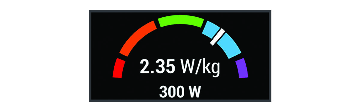 Your FTP estimate appears as a value measured in watts per kilogram, your power output in watts, and a position on the color gauge.