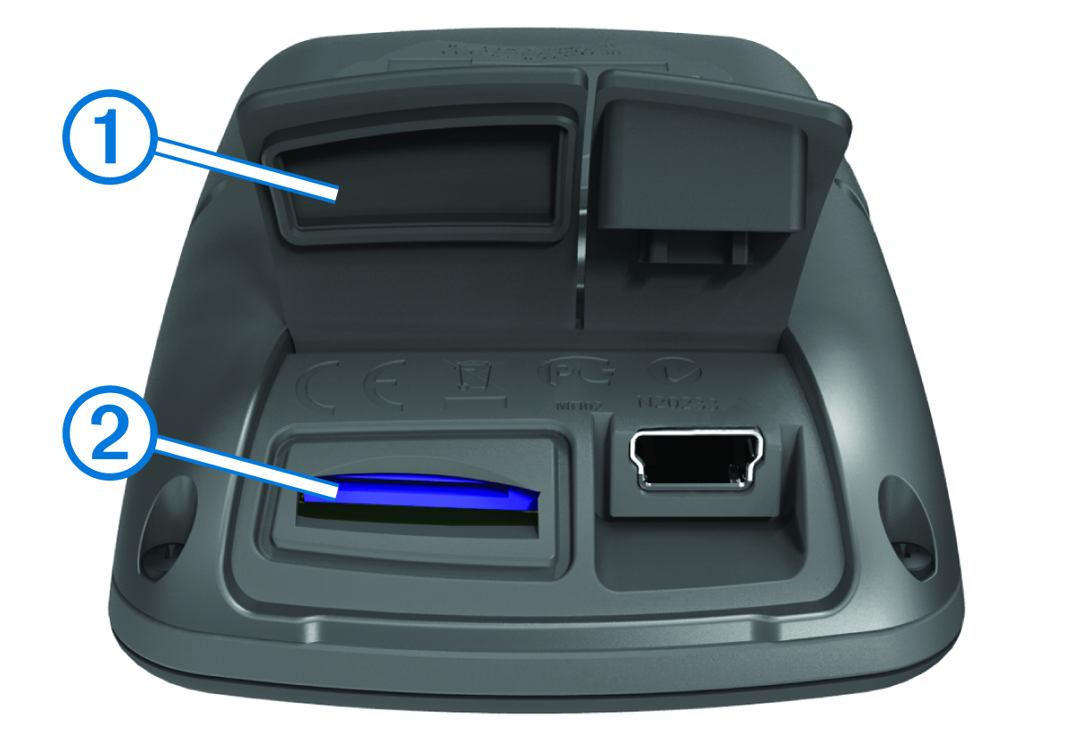 Een geheugenkaart installeren U kunt een microSD™ geheugenkaart installeren voor extra opslagruimte of voorgeladen kaarten. Verwijder de beschermkap van de microSD kaartsleuf . Druk op de kaart tot u hoort dat deze vastklikt. Hoofdonderwerp: GegevensopslagStartGeschiedenisGegevensopslagEen geheugenkaart installeren