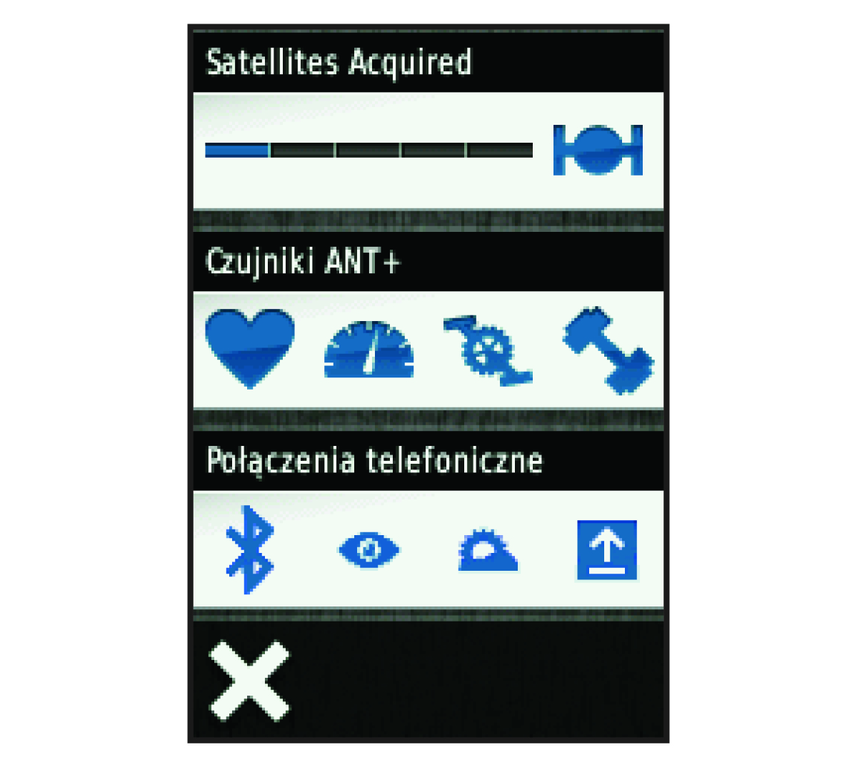Na stronie połączeń wyświetlany jest status sygnałów satelitarnych, czujników ANT+® oraz smartfonu użytkownika.