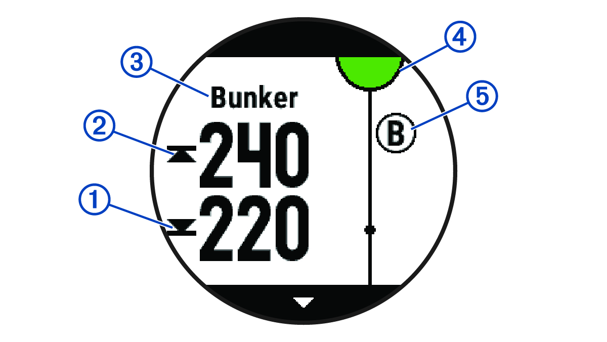 - Naciśnij przycisk UP lub DOWN, aby wyświetlić inne hazardy dla bieżącego dołka.