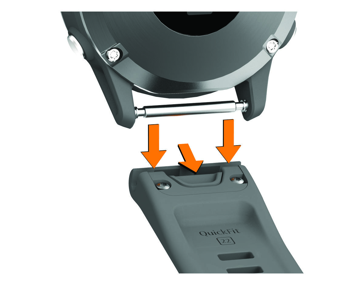 Замена ремешков QuickFit Сдвиньте фиксатор ремешка QuickFit®, чтобы снять ремешок с часов. Приложите новый ремешок к часам. Легким нажатием вставьте ремешок на место. ПРИМЕЧАНИЕ: Убедитесь, что ремешок закреплен надежно. Фиксатор должен защелкнуться на штырьке часов. Повторите шаги с 1 по 3, чтобы заменить вторую половину ремешка. Основной раздел: Обслуживание устройстваГлавная страницаИнформация об устройствеОбслуживание устройстваЗамена ремешков QuickFit