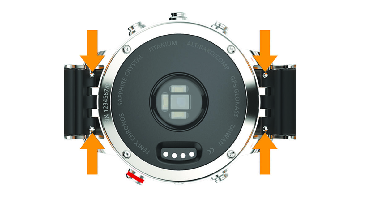 - Drücken Sie die Stifte zusammen, und setzen Sie das Armband ein. HINWEIS: Vergewissern Sie sich, dass das Armband sicher befestigt ist. Der Federsteg muss auf die Löcher am Gerät ausgerichtet sein.