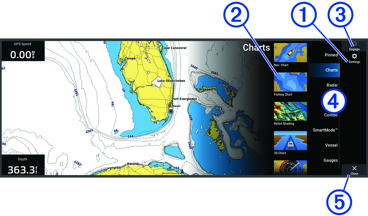 ホーム画面は、チャートプロッターのすべての機能にアクセスできるオーバーレイです。これらの機能はチャートプロッターに接続されているアクセサリによって異なります。このマニュアルで説明する一部のオプションおよび機能を利用できない場合があります。