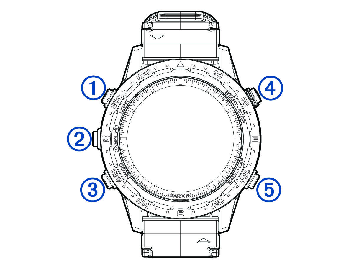 START STOP | Drücken Sie die Taste, um die Aktivitätsliste anzuzeigen und eine Aktivität zu starten oder zu stoppen. Drücken Sie die Taste, um in einem Menü eine Option auszuwählen. Halten Sie die Taste gedrückt, um die Orientierungsrichtung anzuzeigen. |