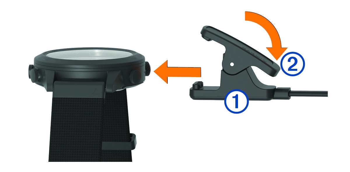 1. قم بمحاذاة أقطاب الشاحن مع الوصلات في الجهة الخلفية من الجهاز واعمد إلى توصيل مشبك الشحن وسيلة الشرح رقم واحد بإحكام بالجهاز.