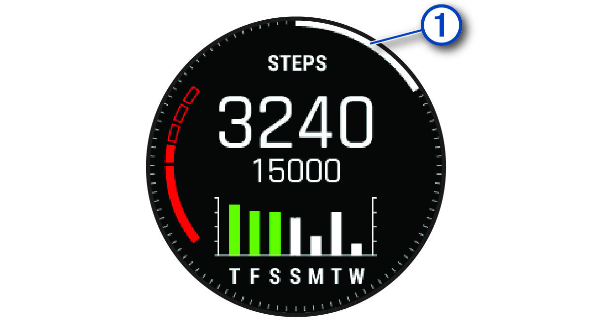 Your device creates a daily step goal automatically, based on your previous activity levels. As you move during the day, the device shows your progress toward your daily goal Callout number one.