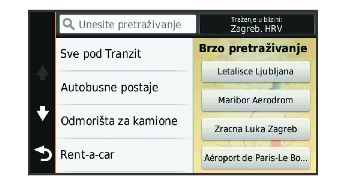 Nakon pretraživanja točaka interesa, na popisu Brzo pretraživanje mogle bi se prikazati određene kategorije s prikazom posljednja tri odabrana odredišta.