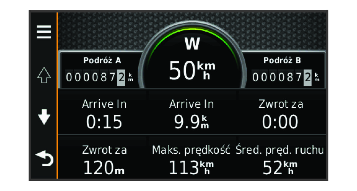 Strona informacji o podróży wyświetla bieżącą prędkość i umożliwia dostęp do statystyk podróży.