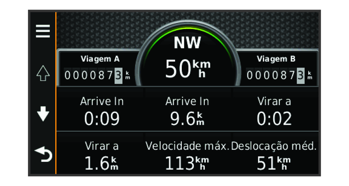 A página de informações de viagem assinala a sua velocidade atual e fornece-lhe dados estatísticos acerca da sua viagem.