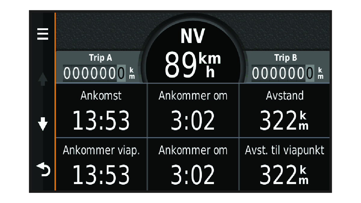 Tripinformasjonssiden viser gjeldende fart og statistikk for turen.