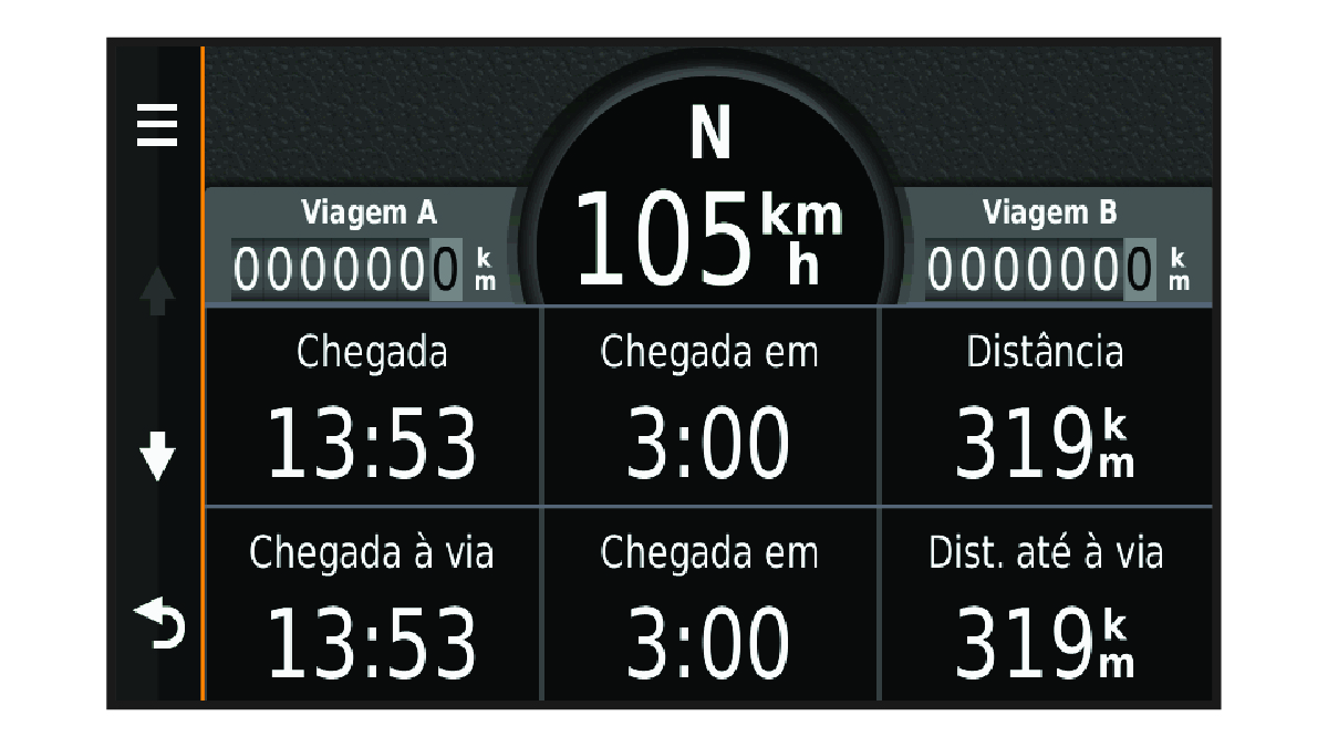 A página de informações de viagem assinala a sua velocidade atual e fornece-lhe dados estatísticos acerca da sua viagem.