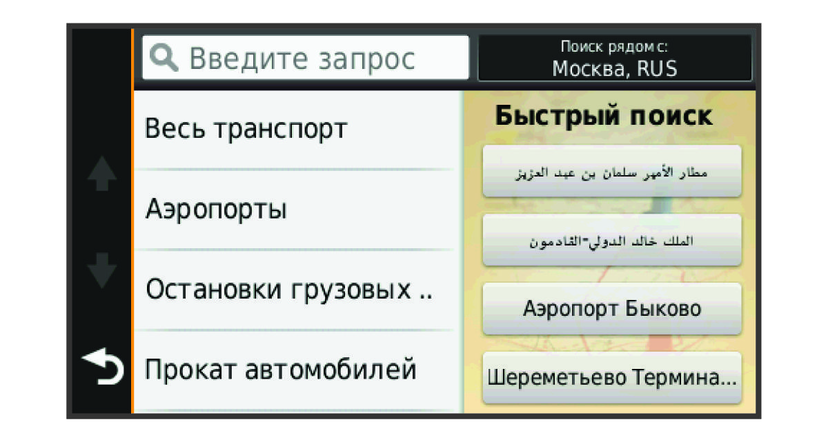 Если поиск объектов уже выполнялся, в некоторых категориях может отображаться список быстрого поиска, в котором показаны последние четыре выбранных пункта назначения.