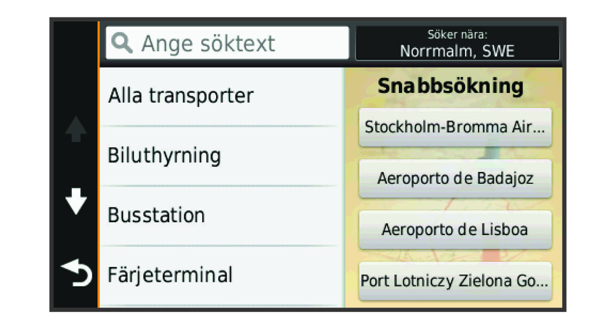 Efter att du har sökt efter en intressant plats kan en snabbsökningslista visas för vissa kategorier. Listan visar dina fyra senast valda destinationer.
