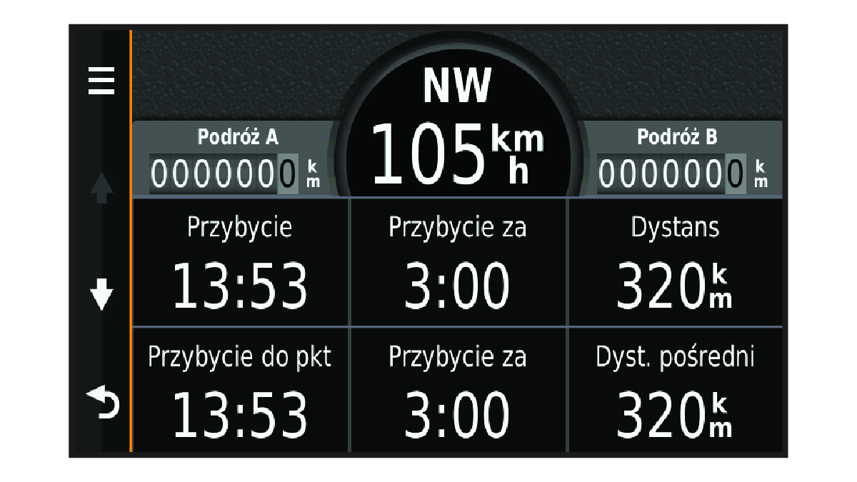 Strona informacji o podróży wyświetla bieżącą prędkość i umożliwia dostęp do statystyk podróży.