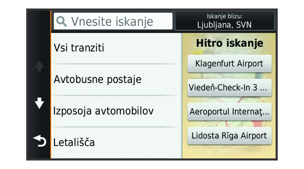 Po iskanju destinacije lahko določene kategorije prikažejo seznam hitrih iskanj, ki prikazuje zadnje štiri izbrane destinacije.