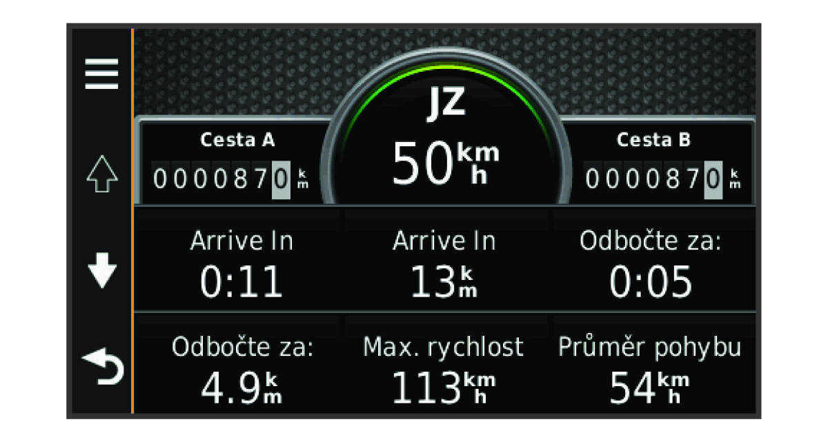 Stránka Informace o cestě zobrazuje současnou rychlost a poskytuje statistické údaje o cestě.