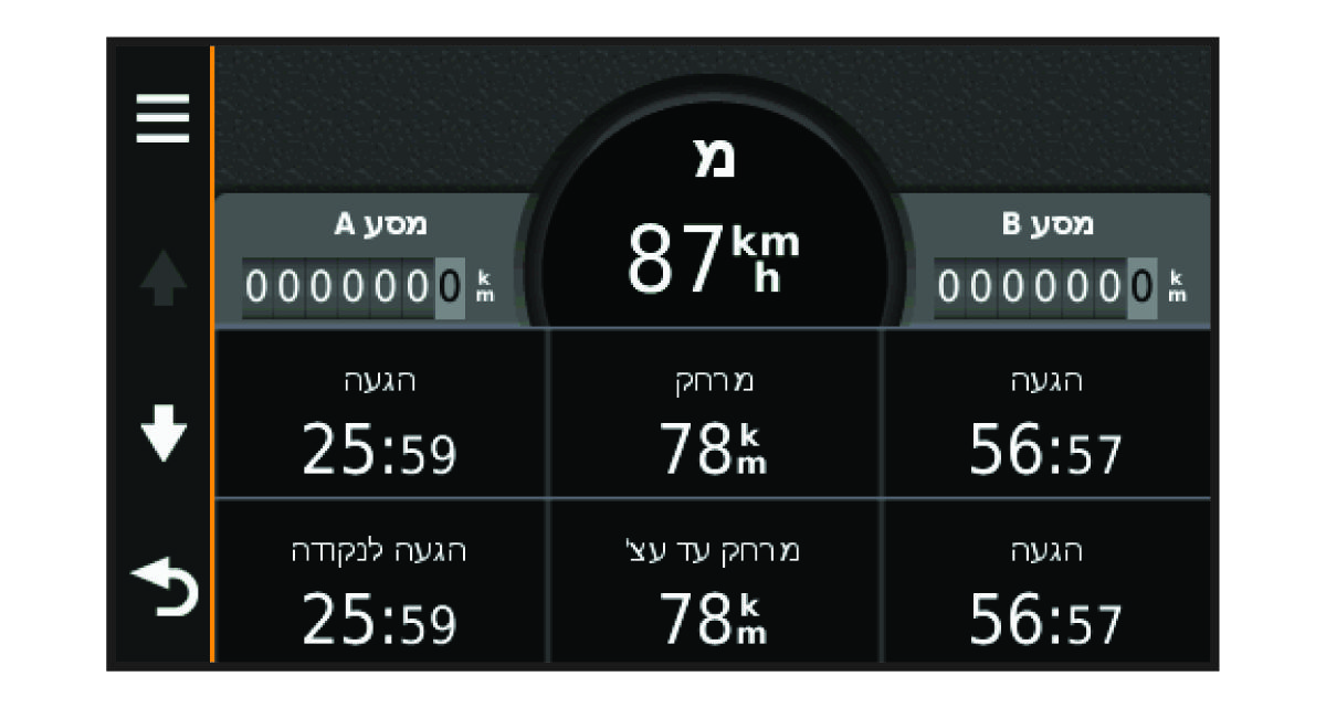 דף פרטי הנסיעה מציג את המהירות הנוכחית ומספק נתונים סטטיסטיים על הנסיעה.