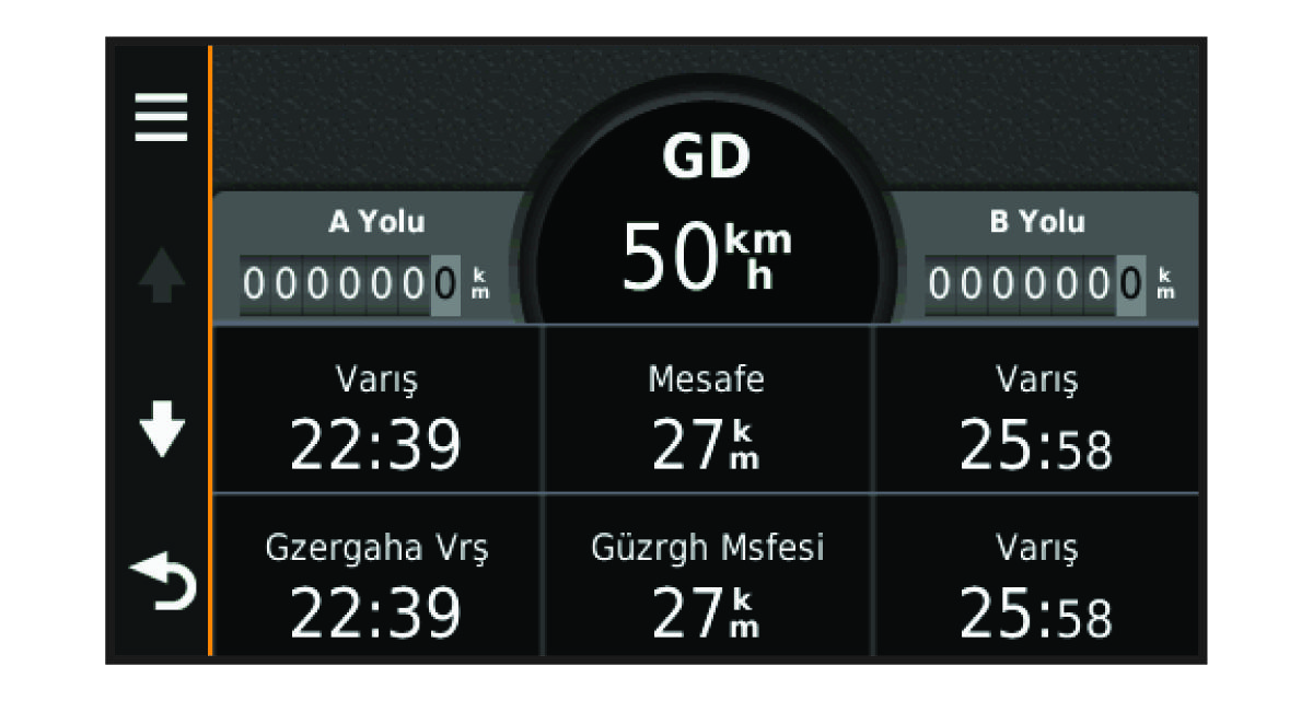Yol bilgisi sayfası, geçerli hızınızı görüntüler ve yolculuğunuzla ilgili istatistikler verir.