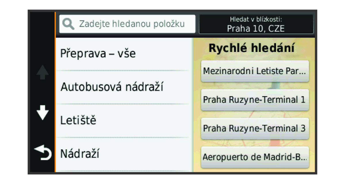 Po hledání bodu zájmu se v některých kategoriích může zobrazit seznam Rychlé hledání, který zobrazuje poslední čtyři vybrané destinace.